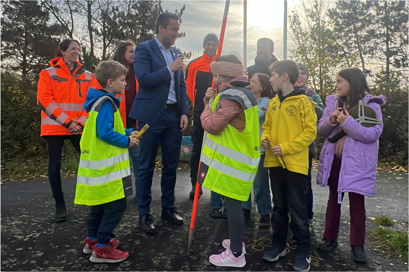 Besonders schön: Die Elefantenklasse (Klasse 3a) der Grundschule Sürster Weg war mit vor Ort und unterstützte die Arbeiten mit großem Engagement. Unter den Kindern ist auch Anni-Lou, die damals – noch bevor der Bürgermeister sein Amt antrat – die Idee eines neuen Rutschenbergs an ihn herantrug. Ihr Wunsch hinterließ Eindruck und setzte den ersten Stein ins Rollen.