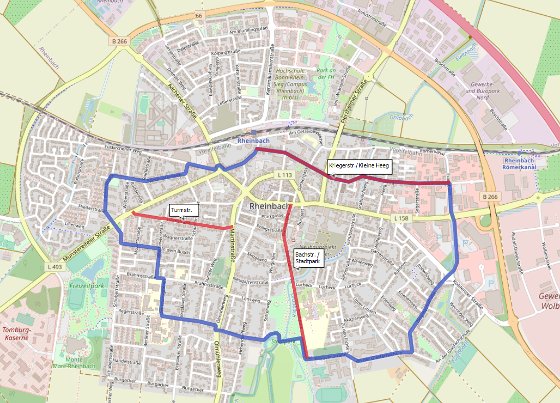 Der Radring Rheinbach ist mit einem eigenen Routenlogo markiert, an dem man sich problemlos orientieren kann. Vom Radring gelangt man an alle wichtigen Standorte in der Kernstadt sowie an die Radwegeanbindungen in die Ortschaften. Plan in Druckansicht