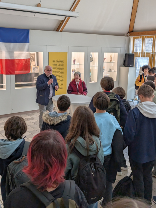 Am Morgen des 2. April trafen sich die französischen und deutschen Schüler in der Mensa der Gesamtschule, wo sie von der Schulleitung herzlich begrüßt wurden. Nach einem gemeinsamen Frühstück begannen die französischen Gäste und ihre gastgebenden deutschen Schüler*innen ihren Rundgang durch die Schule, um mehr über das deutsche Bildungssystem und die Gegebenheiten vor Ort zu erfahren. Anschließend führte Hedwig Schmitt-Wojcizk die französischen Gäste zu einer Besichtigung des historischen Hexenturms und einer Führung durch Rheinbach. Dabei erhielten die Schüler*innen spannende Einblicke in die Rheinbacher Geschichte.