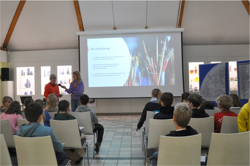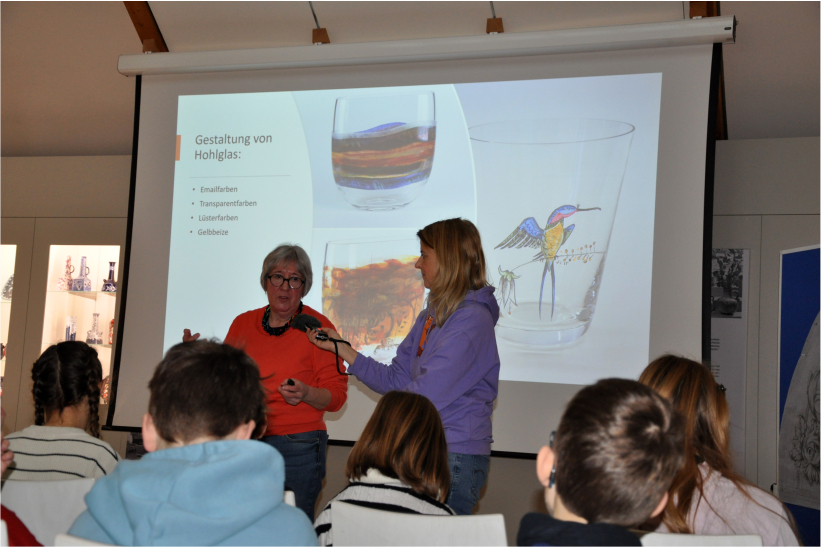 Mit Mausreporterin Christina besuchen sie auch das Glasmuseum, wo sie mit Glaskünstlerin Helga Feuser-Strasdas ein Interview führen und danach ein eigenes Glasbild gestalten.