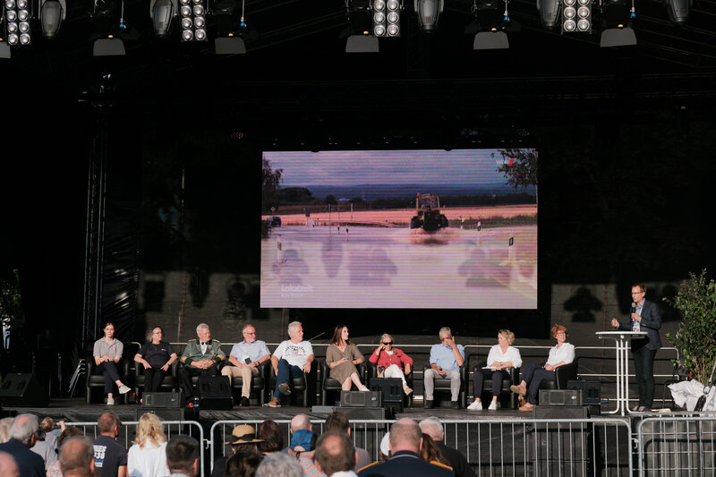 Zentraler Bestandteil der Bühnenprogramm waren zwei Interviewrunden mit sehr interessanten Gästen. Im Gespräch mit Moderator Ralf Henscheidt (bekannt aus der WDR Lokalzeit Bonn) erinnerten u. a. Bürgermeister Ludger Banken, Laurenz Kreuser und Sebastian Zikeli von der Feuerwehr, Oberst Norbert Schmidt und Alexander Doben des Rheinbacher Bundeswehrstandortes sowie Bernd Schreiber und Matthias Puls vom DRK an die schwierige Situation in den Tagen rund um die Katastrophe und danach.