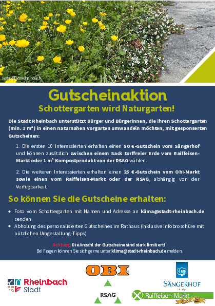 Um die Umgestaltung attraktiver zu machen und einen konkreten Anstoß zu geben, hat die Stadt Rheinbach gemeinsam mit lokalen Partnern eine Gutscheinaktion ins Leben gerufen. Unterstützt wird die Aktion vom OBI Markt Rheinbach, dem Raiffeisen-Markt Rheinbach, dem Sängerhof Meckenheim sowie der RSAG.