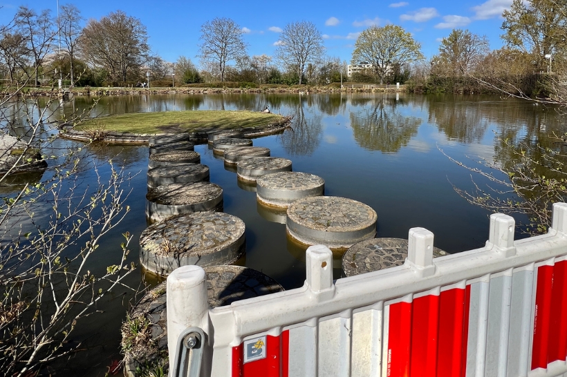 Im Freizeitpark Rheinbach haben sich erneut Kanada-Gänse zur Brut niedergelassen. Um die Tiere während dieser sensiblen Phase zu schützen, hat der Betriebshof das betroffene Plateau vorübergehend abgesperrt.