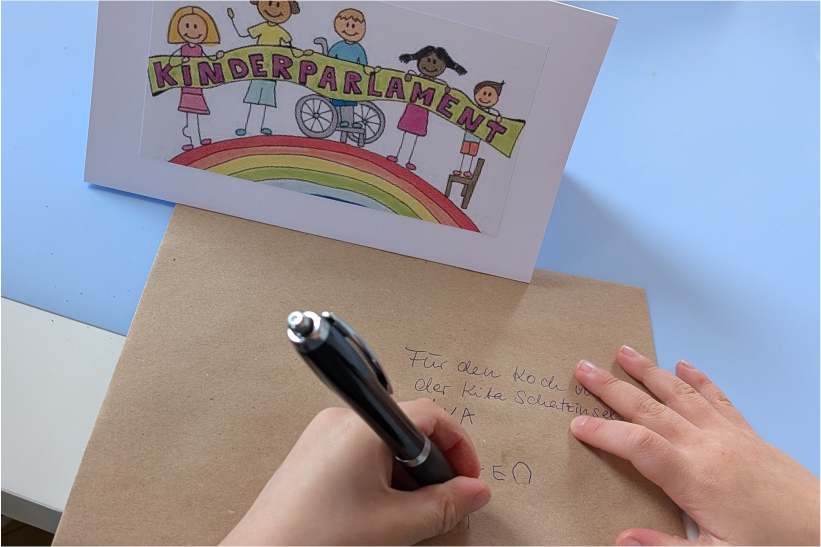Wichtig war den Kindern weiterhin der Wunsch nach Pizza zum Mittagessen. Der Parlamentsvorstand kümmerte sich darum, dass die Kinder gemeinsam einen Brief an den Koch verfassten, indem diese Bitte mitgeteilt wird. Zusammen mit Teresa machten wir den Brief versandfertig.