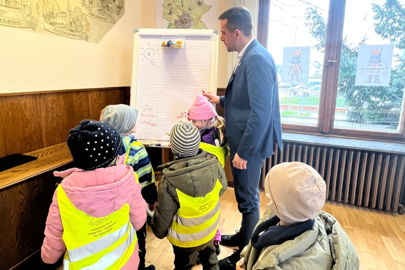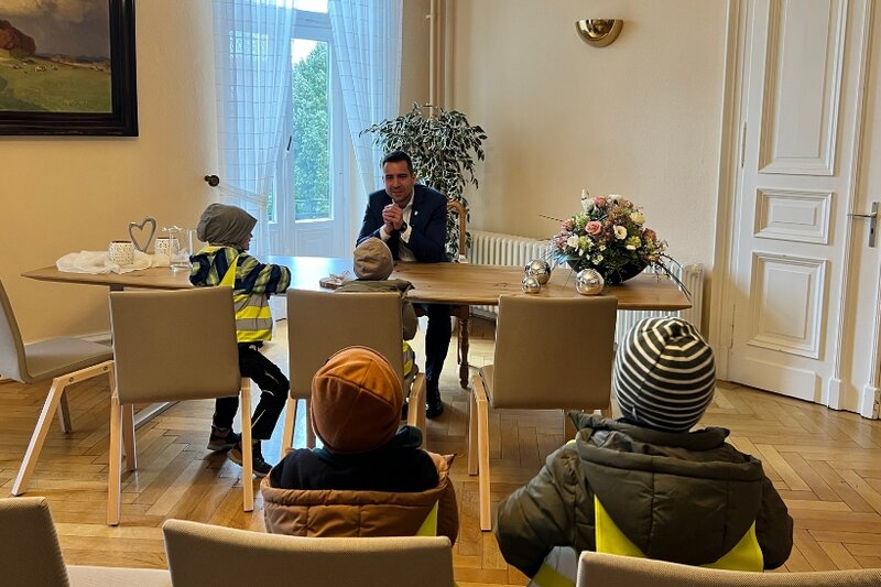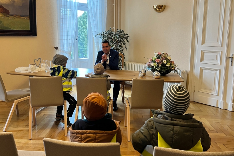 Neun Kinder des Kinderparlaments der KiTa Schatzinsel waren am 24. Februar zu Gast bei Bürgermeister Dr. Phiesel im Rathaus. Im Bürgermeisterbüro stellten sie viele Fragen und erfuhren aus erster Hand, wie der Arbeitsalltag eines Bürgermeisters aussieht.