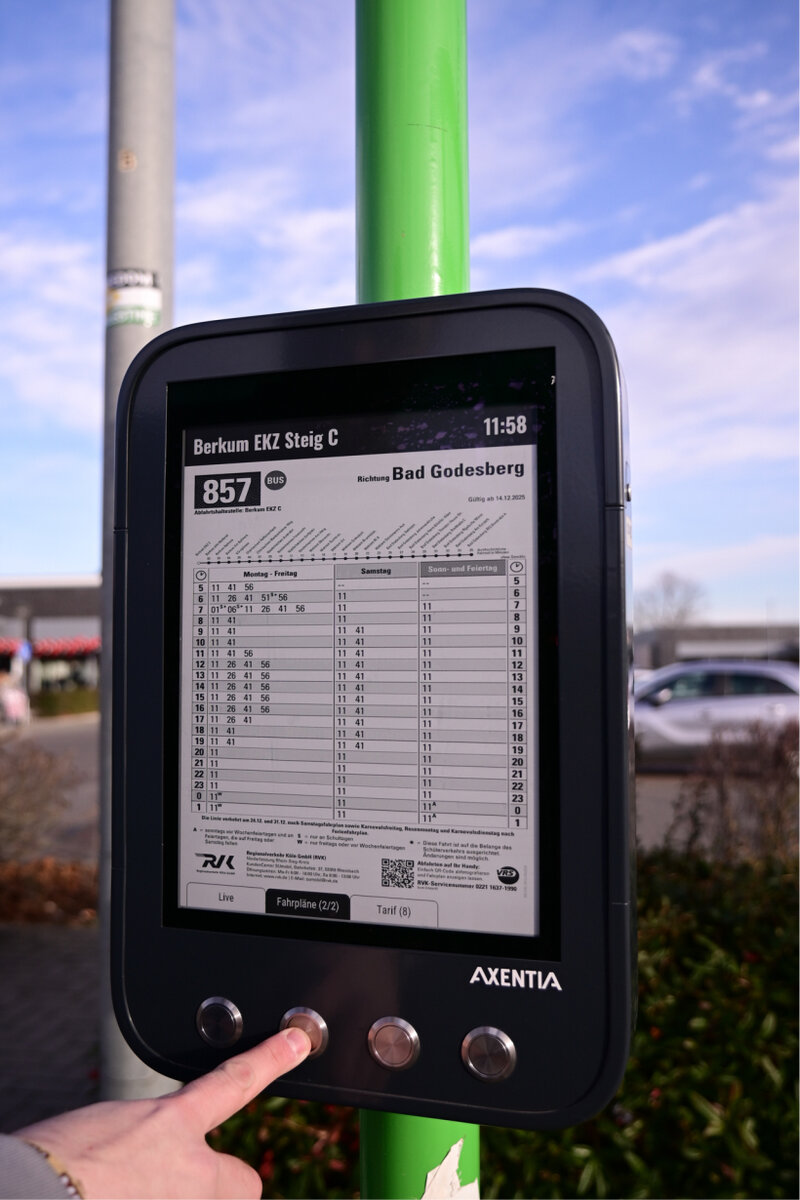Die digitale Haltestelle ermöglicht den direkten, aktuellen Abruf von relevanten Informationen für Fahrgäste, wie beispielsweise Abfahrtszeiten, Linienfahrpläne, Tarifübersichten oder aktuelle Störungsmeldungen. Sie ist bereits an mehreren Haltestellen in Alfter, Bornheim, Meckenheim, Rheinbach, Swisttal und Wachtberg installiert.