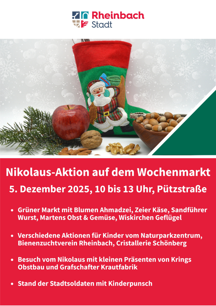 Am Freitag, 5. Dezember 2025, findet auf dem Rheinbacher Wochenmarkt eine besondere Nikolaus-Aktion statt. Von 10:00 bis 13:00 Uhr erwartet die Besucherinnen und Besucher auf dem Grünen Markt ein vielfältiges Angebot regionaler Händler. Mit dabei sind Blumen Ahmadzei, Zeier Käse, Sandführer Wurst, Martens Obst & Gemüse sowie Wiskirchen Geflügel.