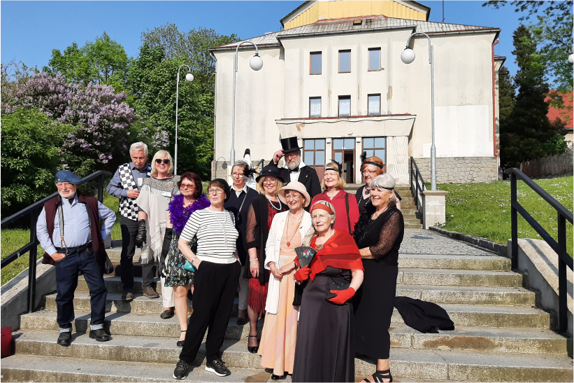 Am 27.05 steht ein Teil der Gruppe auf der Freitreppe vor dem Kino von Kamenický Šenov (Steinschönau), für eine Veranstaltung im Stil der 1920er Jahre.