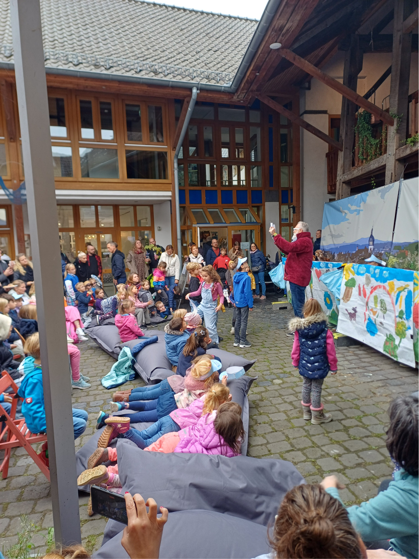 Kinder und Erwachsene im Publikum wurden spielerisch in das Theaterstück eingebunden. Es begann eine große Müllsortieraktion in verschiedene Abfalltonnen, gestellt von der RSAG (Rhein-Sieg Abfallwirtschaftsgesellschaft mbH).