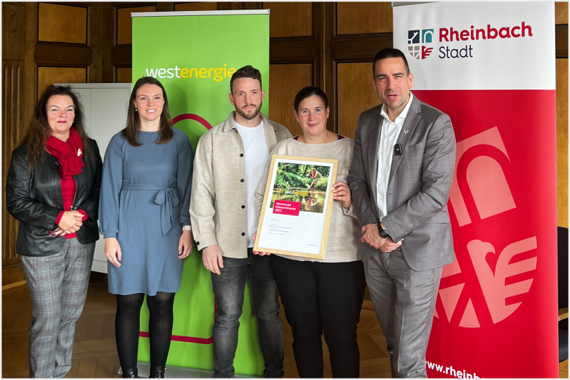 In diesem Jahr ging die Elterninitiative Naturkindergarten e.V. als Preisträgerin aus dem Wettbewerb hervor. Die Urkunde und das symbolische Preisgeld von 1.500 Euro wurden heute von Bürgermeister Dr. Daniel Phiesel und Lydia Bauer, Kommunalbetreuerin der Westenergie AG, im Rheinbacher Rathaus übergeben.