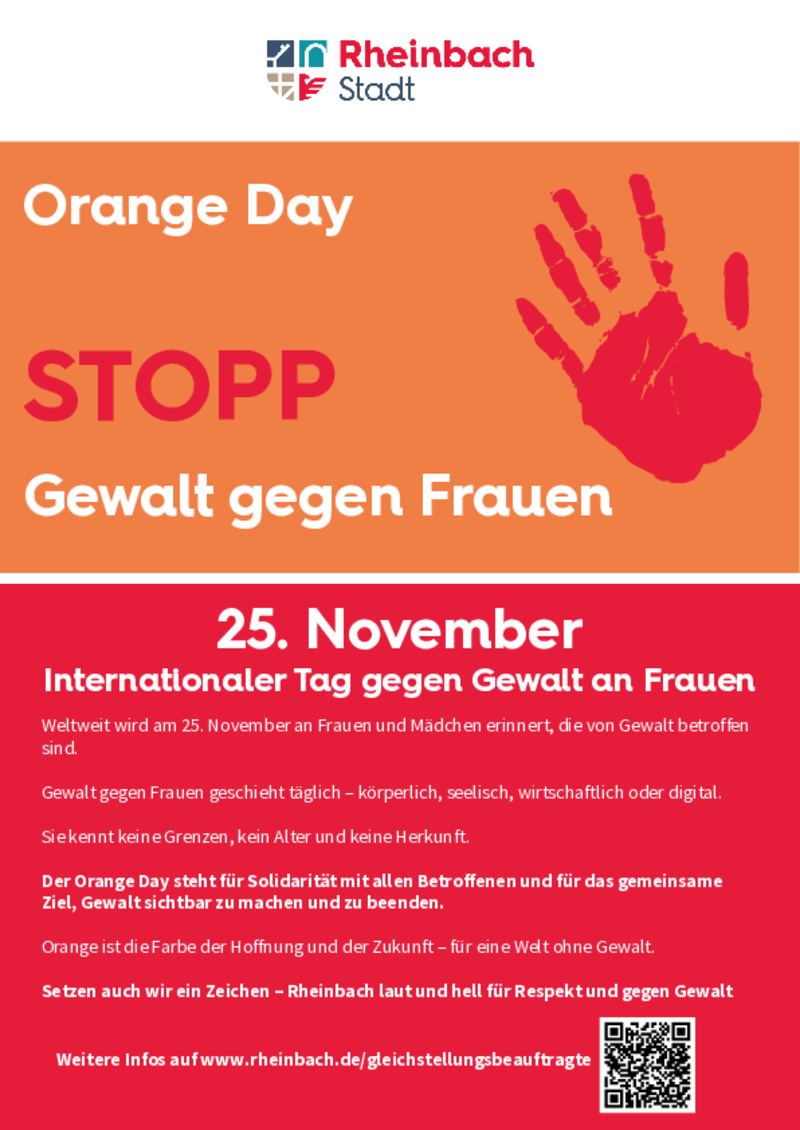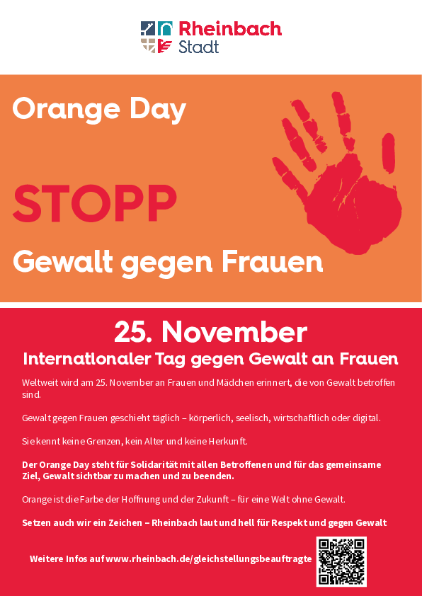Mit den Orange Days setzt die Stadt Rheinbach jedes Jahr ein kraftvolles Zeichen: gegen Gewalt an Frauen und Mädchen und für eine respektvolle, solidarische Stadtgesellschaft. Beleuchtete Gebäude, kreative Aktionen, Workshops und Informationsangebote machen das Thema sichtbar, schaffen Bewusstsein und ermutigen Betroffene wie Beteiligte gleichermaßen, hinzusehen, zu handeln und Unterstützung zu suchen. Die Orange Days zeigen – laut, hell und unübersehbar – wofür Rheinbach steht: für Respekt, Gleichberechtigung und Zivilcourage.