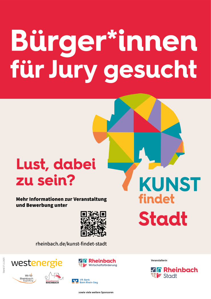 Für die Auswahl der Ausstellenden von Kunst findet Stadt 2026 sucht die Stadt Rheinbach drei engagierte Bürger*innen, die sich als Teil der Jury an der Entscheidung über die eingereichten Kunstprojekte beteiligen möchten. Auch junge Menschen (ca. 14–21 Jahre) sind herzlich eingeladen, dabei zu sein und ihre Sicht auf Kunst einzubringen.