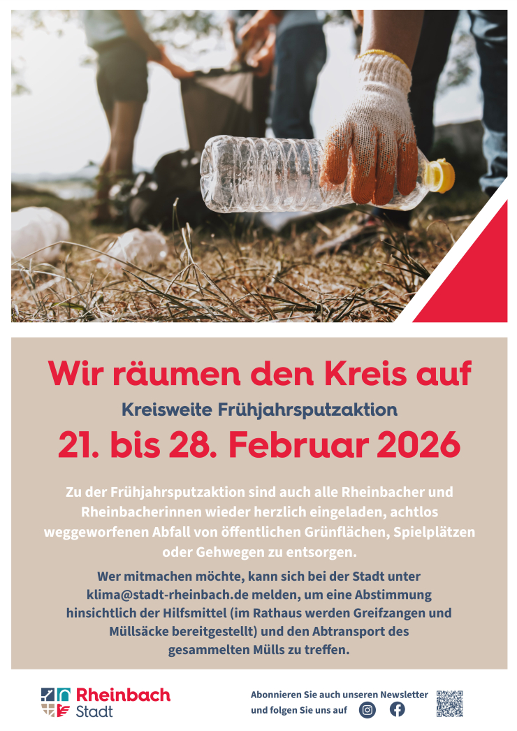 Auch in diesem Jahr nimmt die Stadt Rheinbach an der kreisweiten Umweltaktion „Wir räumen den Kreis auf“ teil. Die von der Rhein-Sieg-Abfallentsorgungsgesellschaft (RSAG) organisierte Aktion ist Teil der europaweiten Kampagne „Let’s Clean Up Europe“, die seit 2014 dazu ermutigt, gemeinsam aktiv gegen Umweltverschmutzung vorzugehen.