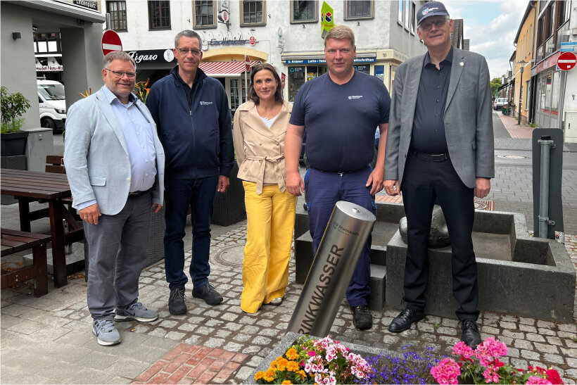 Am Lindenplatz in Rheinbach steht jetzt ein öffentlicher Trinkwasserbrunnen. Bürgermeister Ludger Banken hat am Vormittag im Beisein von Ralf Kabus, Stadtkämmerer und Betriebsleiter des Rheinbacher…