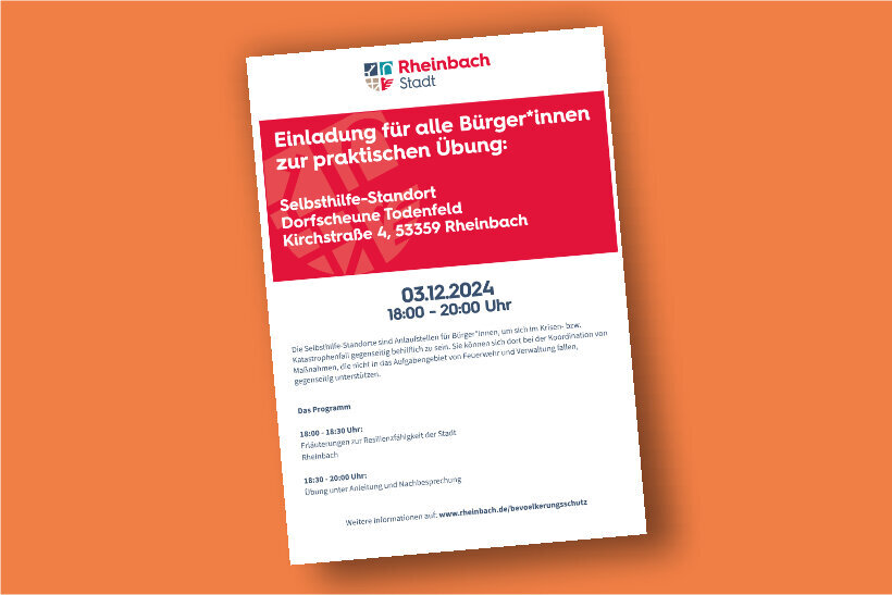 Die Stadt Rheinbach lädt alle Bürgerinnen und Bürger aus Todenfeld herzlich zu einer praktischen Selbsthilfe-Übung ein, die am 3. Dezember 2024 von 18:00 bis 20:00 Uhr in der Kirchstraße 4, 53359…