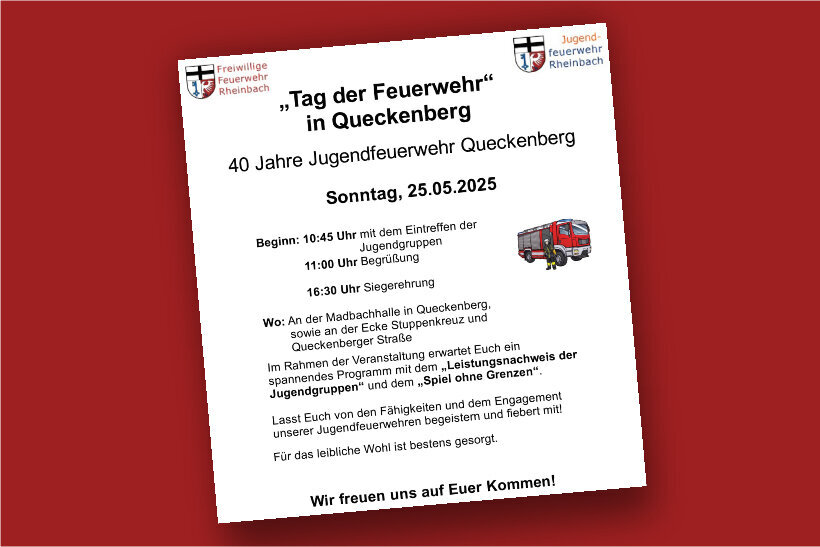 Am Sonntag, dem 25. Mai 2025 veranstaltet die Löschgruppe Queckenberg der Freiwilligen Feuerwehr der Stadt Rheinbach anlässlich des 40-jährigen Bestehens der Jugendfeuerwehr Queckenberg den Tag der…